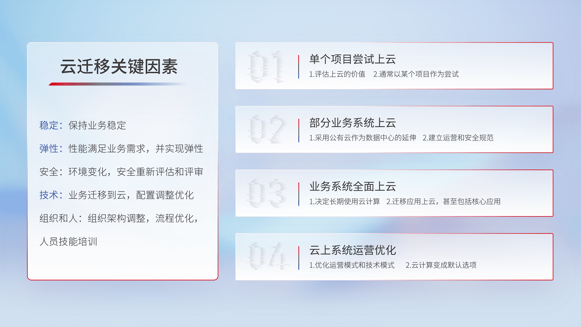 结合实际业务,,,从规划设计、、、云平台选型、、云原生改造、、、、数据迁移、、、、集成交付,,,,迁移全过程为客户识别最佳上云路径,,,,做好风险识别管理,,设计网络架构、、身份权限、、安全审计合规、、操作审计、、日志审计、、监控告警策略、、、多站点容灾设计等,,对云上基础设施进行整体规划,,提升IT治理水平,,,以满足弹性、、、高可用、、、、高性能的需求。。