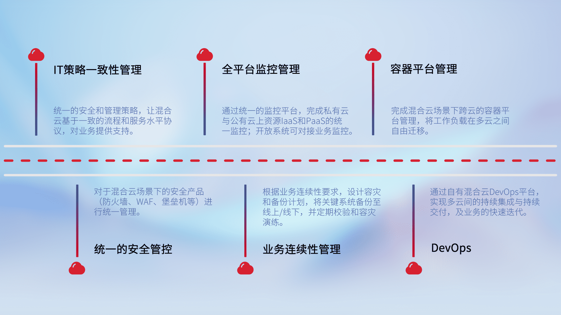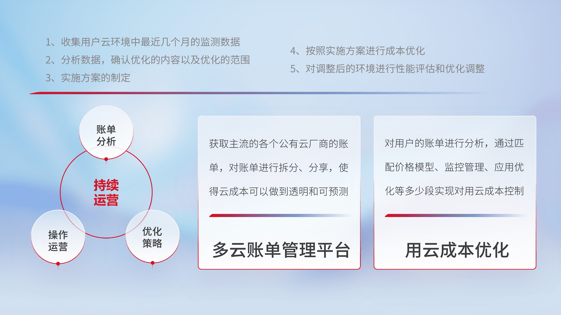 通过多云纳管,,,以统一的资源数据模型把客户的云资源进行抽象和封装,,,,进而实现对多云资源的统一操作,,,,保障云资源管理的可靠性、、、稳定性与可用性。。量身定制化运维内容,,,配置、、、开发运维、、、、补丁管理、、、备份、、、、监控、、、认证和访问管理、、、、审计和日常巡检等,,保障在用云过程中的可靠度,,,稳定度以及高可用率。。。