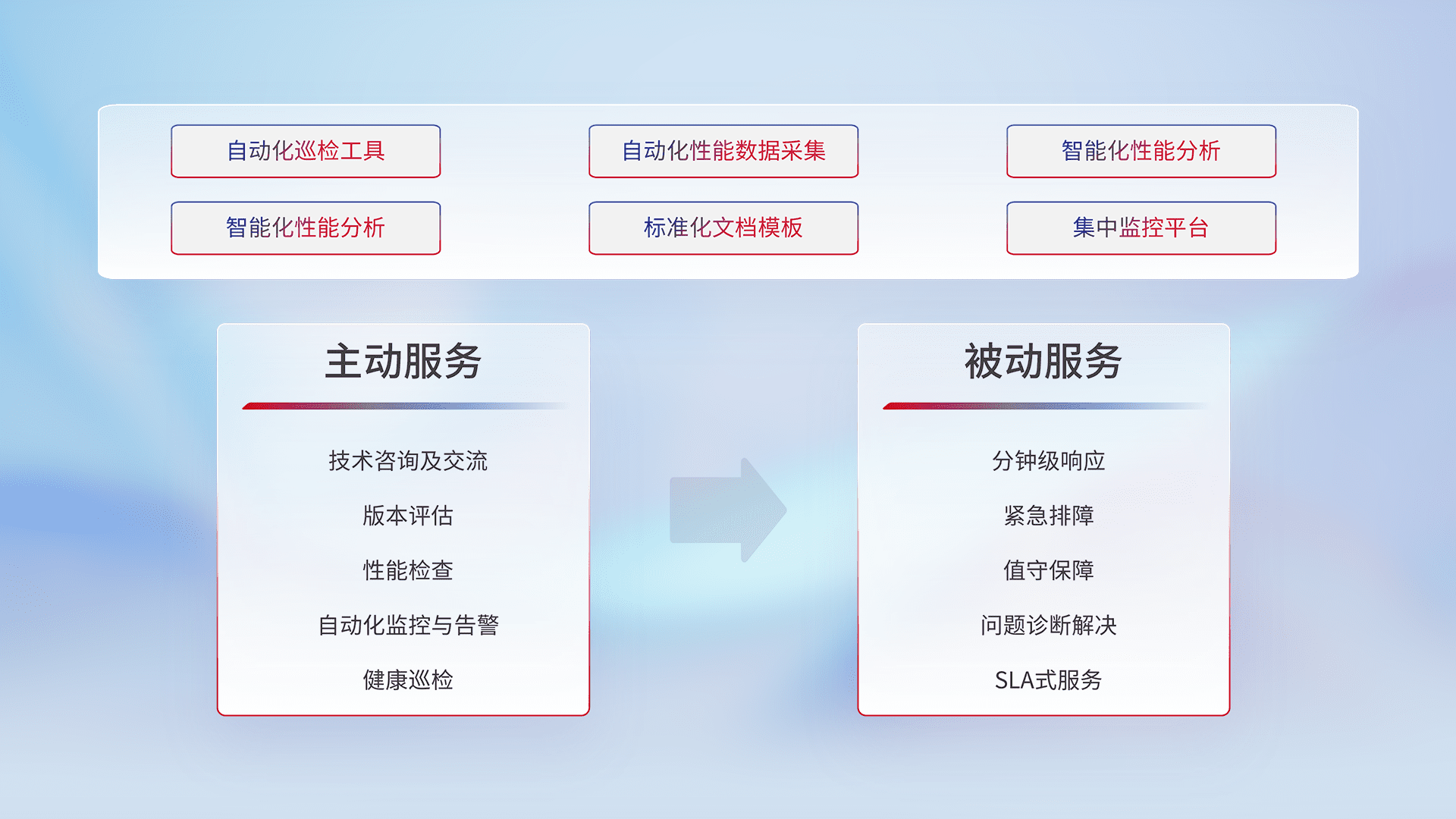 智能化工具和标准化文档,,,,保障服务质量,,,提供主动服务(包含技术咨询、、版本评估、、性能检查、、、、自动化监控与告警、、健康巡检)和被动服务包含(分钟级响应、、、、紧急排障、、、值守保障、、、问题诊断解决、、、、SLA服务)。。。。